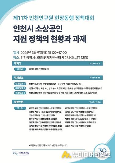 인천연구원은 2026년 3월 9일 오후 3시 인천광역시사회적경제지원센터 세미나실에서 “인천시 소상공인 지원 정책의 현황과 과제”라는 주제로 '제11차 현장동행 정책대화'를 개최한다.