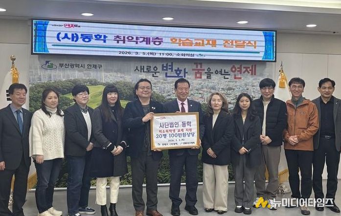 연제구는 지난 3월 5일, 사단법인 동학(이사장 남중현)으로부터 관내 저소득 취약계층 세대 지원을 위한 학습교재를 전달받았다.