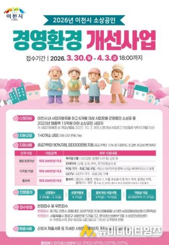 공고 기간은 2026년 3월 9일부터 4월 3일까지이며, 신청 접수는 3월 30일부터 4월 3일까지 5일간 현장 접수(이천시 상권활성화센터 내 다목적실, 이천시 경충대로 2697번길 306 설봉공원 내)와 우편 접수(한국생산성본부 9층 소상공인성장센터, 서울특별시 종로구 새문안로 5가길 32)를 병행한다.