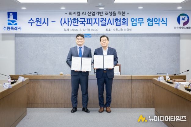 수원특례시와 (사)한국피지컬에이아이(AI)협회는 6일 시청 상황실에서 업무협약을 체결하고, 피지컬 인공지능(AI) 산업 활성화를 위해 적극적으로 협력하기로 했다.