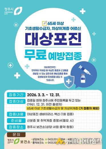 청주시는 면역력이 저하되는 고령 취약계층의 건강 보호를 위해 ‘대상포진 예방접종 지원사업’을 첫 시행한다고 8일 밝혔다.