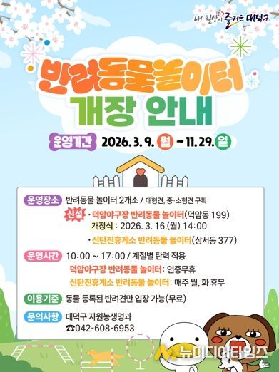 대덕구는 덕암야구장(덕암동 199)과 신탄진휴게소(상서동 377)에 반려동물 놀이터를 조성하고 3월 9일부터 운영에 들어간다고 밝혔다.