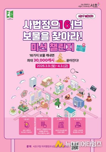 전성수 서초구청장은 “이번 챌린지를 통해 주민들이 사법정의 허브 공간을 자연스럽게 경험하고 일상 속 걷기의 즐거움도 함께 느끼길 바란다”며 “3월 9일 공개되는 16곳의 보물을 직접 찾아보며 미션 성공의 기쁨을 누리길 기대한다”고 말했다.