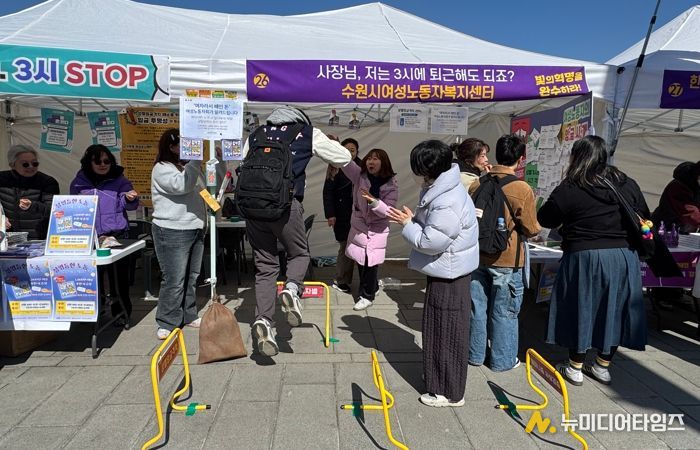 수원시 여성노동자복지센터는 7일 광화문 서십자각에서 열린 ‘제41회 한국여성대회’ 현장에서 시민을 대상으로 ‘일·생활 균형 인식개선 캠페인’을 펼쳤다.