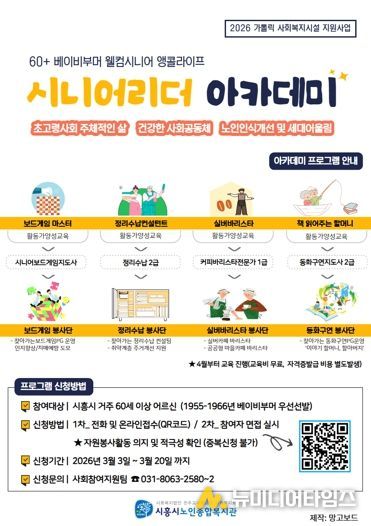 시흥시노인종합복지관은 천주교수원교구의 지원을 받아 베이비부머 세대를 위한 전문자격 양성과정 ‘시니어리더 아카데미’를 오는 4월부터 운영하는 가운데, 참가 어르신을 모집한다.