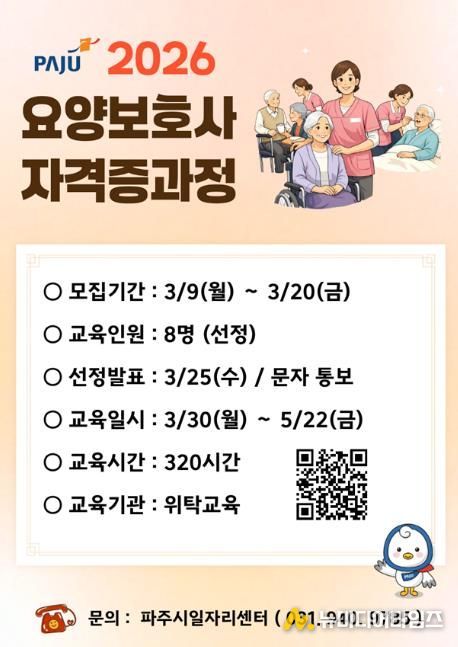 모집 기간은 3월 9일부터 3월 20일까지이며, 신청 대상은 요양보호사로 취업을 희망하는 파주시 거주 구직자다.