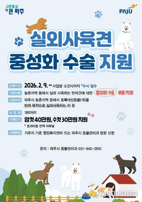파주시는 실외에서 사육되는 반려견의 무분별한 번식을 예방하고 유실·유기 동물 발생을 줄이기 위해 녪년 실외사육견 중성화수술 지원사업’을 2월 9일부터 추진하고 있다.