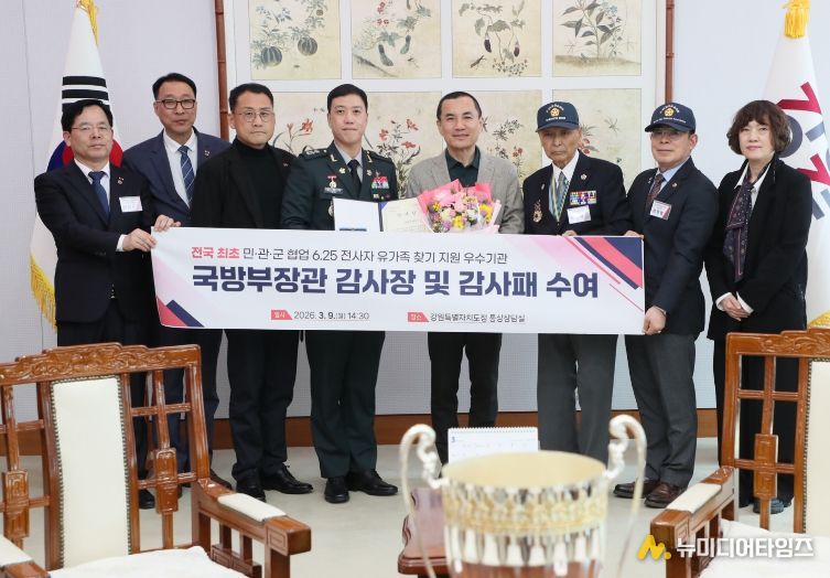 강원특별자치도는 국방부 유해발굴감식단이 추진한 ‘2025년 민·관·군 협업 6·25전사자 유가족 집중 찾기’ 사업에서 전국 최초 민관군 협업 6.25전사자 유가족 찾기 지원 우수기관으로 선정돼, 3월 9일 국방부장관으로부터 감사장과 감사패를 수상했다고 밝혔다.