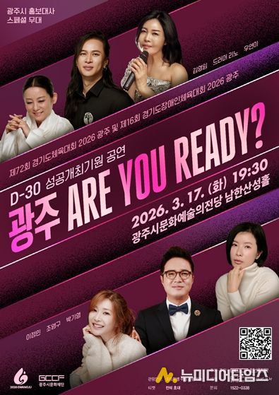 광주시문화재단은 오는 3월 17일 오후 7시 30분, 광주시문화예술의전당 남한산성홀에서 ‘제72회 경기도체육대회 2026 광주 및 제16회 경기도장애인체육대회 2026 광주 D-30 성공기원 공연’ '광주! ARE YOU READY?'’를 개최한다.