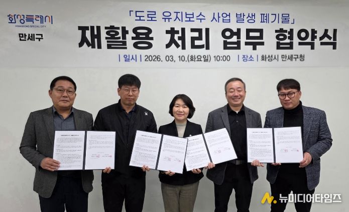 화성특례시 만세구가 도로 유지보수 과정에서 발생하는 폐기물을 효율적으로 처리하고 자원 재활용을 확대하기 위해 관내 아스콘 생산 업체와 ‘폐아스콘 재활용 처리 협약’을 체결했다.