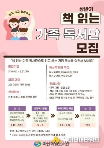 ‘책 읽는 가족 독서단’ 모집 및 운영에 대한 자세한 내용은 마산회원도서관으로 문의하면 된다.