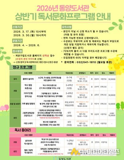 수강 신청 기간은 3월 17일 오전 10시부터 3월 30일 오후 6시까지이며, 계양구립도서관 누리집을 통해 선착순으로 접수한다. 보다 자세한 사항은 누리집 내 독서문화프로그램 안내를 참고하거나, 동양도서관 아동자료실로 문의하면 된다.