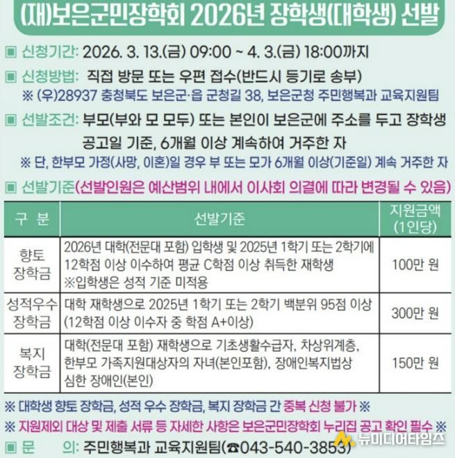 재단법인 보은군민장학회는 지역 인재 육성과 교육 지원을 위해 2026년 대학생 장학생을 4월 3일까지 모집한다고 16일 밝혔다.