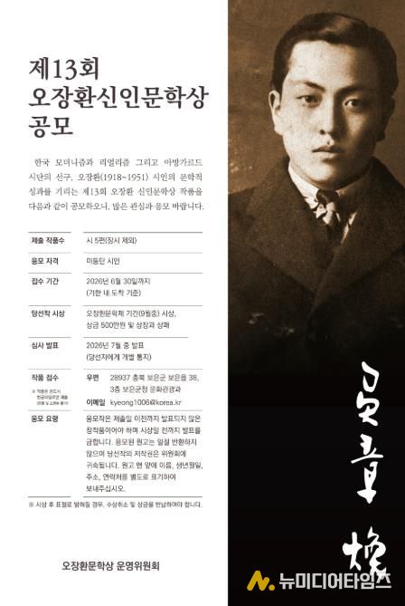 충북 보은군과 오장환 문학상 운영위원회는 한국 모더니즘과 리얼리즘, 아방가르드 시단의 선구자로 평가받는 오장환(1918~1951) 시인의 문학 정신을 기리고 유망한 신인 시인을 발굴하기 위해 ‘제13회 오장환 신인문학상’ 작품을 공모한다.