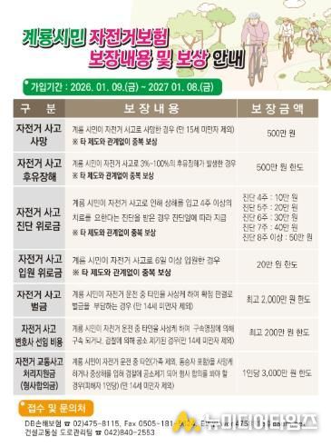 시에 따르면 자전거 보험의 보장 기간은 2027년 1월 8일까지이며, 계룡시에 주민등록을 둔 시민이면 별도의 가입 절차 없이 자동으로 보험 혜택을 받을 수 있다.