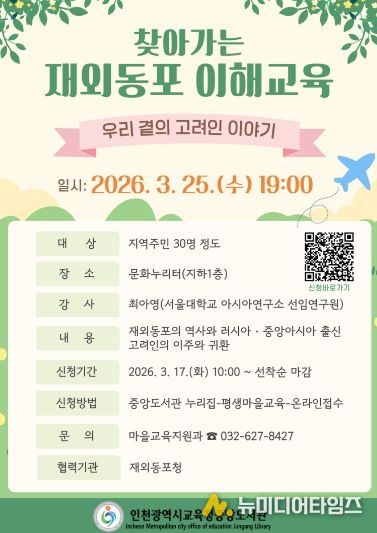 인천광역시교육청중앙도서관은 오는 17일부터 찾아가는 재외동포 이해교육 ‘우리 곁의 고려인 이야기’ 참여자를 모집한다.
