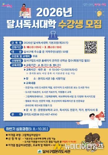 대구 달서구는 독서지도 전문 인력 양성과 구민의 독서문화 확산을 위해‘2026년 달서독서대학 기본과정 제20기’수강생을 3월 18일부터 달서구립도서관 홈페이지를 통해 선착순 모집한다.