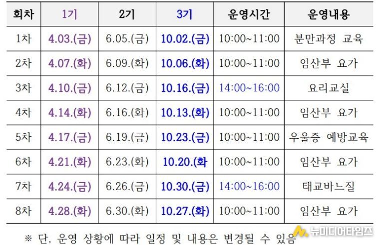 프로그램은 임산부 요가교실을 비롯해 분만 과정 이해, 이유식 만들기, 태교 바느질, 산전·산후 우울증 예방 교육 등 전문가 특강으로 구성된다.