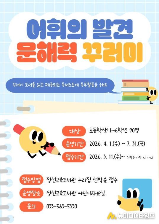 꾸러미 도서는 교과 연계 도서, 기관·단체 추천도서 등을 반영해 선정했으며, 어휘의 발견 ‘문해력 꾸러미’는 현재 정선교육도서관 누리집에서 신청할 수 있다.