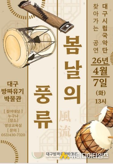 4월 7일에는 봄날을 만끽하는 상춘객을 대상으로 ‘봄날의 풍류’라는 주제로 대구시립국악단의 수준 높은 공연을 개최한다. 오후 1시부터 국악과 풍류를 즐길 수 있어, 관람객에게 특별한 시간을 선사할 예정이다.