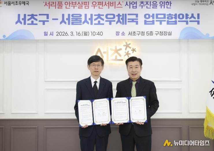 이번 협약은 행전안전부가 주관하는 ‘2026년 읍면동 스마트 복지·안전 개선모델 지원사업’(안부살핌 우편서비스 사업 부문) 공모에 서초구가 서울시 자치구 중 유일하게 선정된 데 따른 것으로, 구는 오는 4월부터 12월까지 ‘서리풀 안부살핌 우편서비스 사업’을 본격 추진할 계획이다.