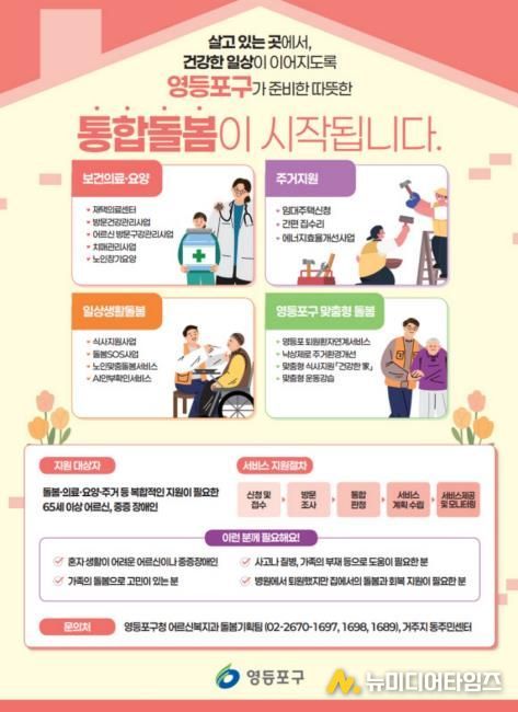 영등포구가 오는 27일 전국적으로 ‘지역사회 통합돌봄 제도’가 시행됨에 따라 의료·요양·돌봄 서비스를 한 번에 제공하는 ‘영등포형 통합돌봄’ 사업을 본격 추진한다고 밝혔다.
