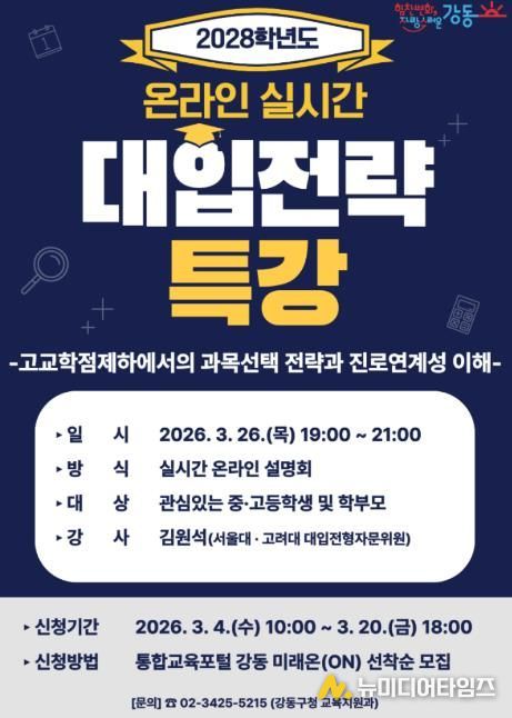 서울 강동구는 2028학년도 대입제도 변화에 대비하기 위해 오는 3월 26일(목) 오후 7시에 온라인 대입전략 특강을 개최한다고 17일 밝혔다.
