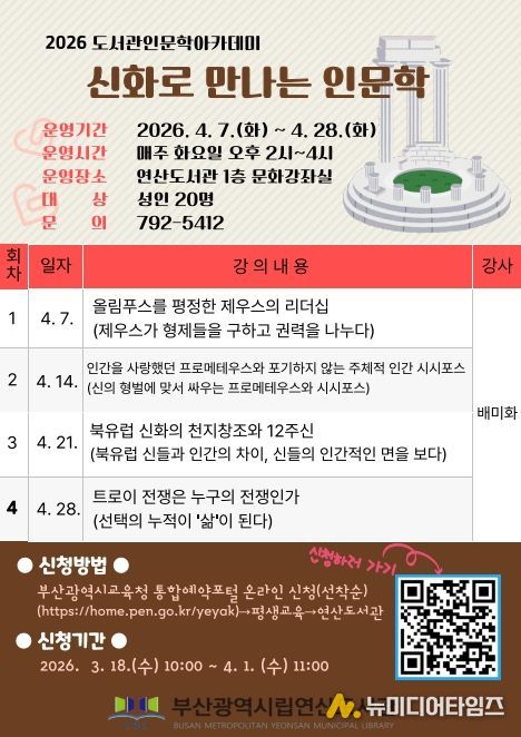 부산시교육청 연산도서관은 4월 7일부터 28일까지 매주 화요일 오후 2시부터 도서관 문화강좌실에서 성인 20명을 대상으로 도서관 인문학 아카데미 ‘신화로 만나는 인문학’을 개최한다.