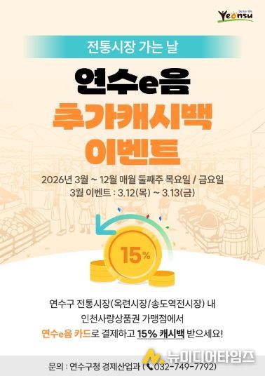 연수구는 이달부터 12월까지 매월 둘째 주 목요일과 금요일에 ‘전통시장 가는 날 연수e음 추가 캐시백 이벤트’를 운영한다.