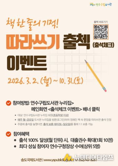 연수구립도서관은 구민의 일상 속 독서 습관 형성과 도서관 누리집 이용 활성화를 위해 ‘책 한 줄의 기적! 따라쓰기 출첵 이벤트’를 10월 31일까지 운영한다.