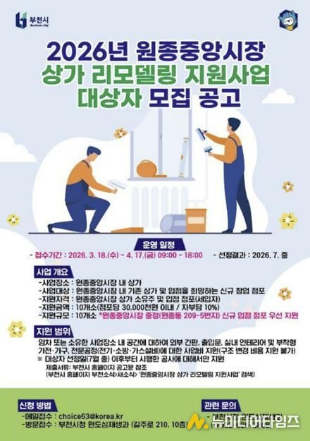 부천시는 3월 18일부터 4월 17일까지 ‘원종중앙시장 상가 리모델링 지원사업’ 대상자를 모집한다.