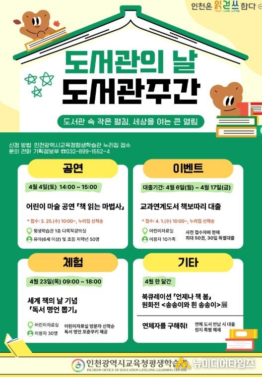 인천광역시교육청평생학습관은 제4회 도서관의 날과 도서관주간을 기념하여 4월 한 달간 지역 주민을 위한 다양한 독서문화 행사를 운영한다.