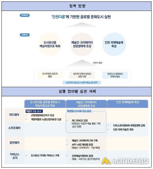 그리고 이러한 방향성 속에서 근현대 문화유산지구 조성, 인천개항도시박물관 및 인천노동산업자료관 신설, 도시유산 가치화 거버넌스 구축, 유휴공간의 예술적 전환, 예술인・크리에이터 DB 구축, 예술과 비즈니스를 연계한 ART×BIZ 매칭랩 운영, 인천예술지원허브 운영, 디아스포라영화제 국제 경쟁력 강화, 인천 국제 미술전 개최 등의 실천 과제를 제안했다.