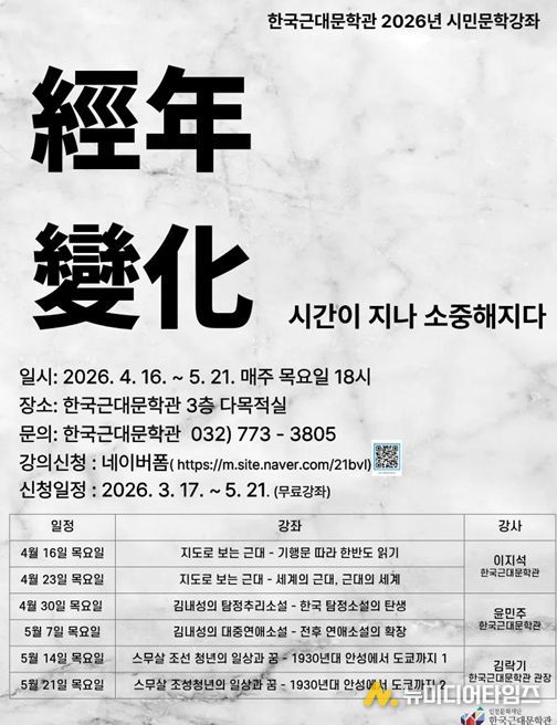인천문화재단 한국근대문학관이 2026년 4월 16일부터 총 6회에 걸쳐, 매주목요일 '經年變化 – 시간이 흘러 소중해지다'강좌를 진행한다.