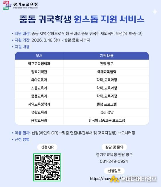 지원 대상은 중동 지역 정세 악화로 국내에 중도 귀국한 재외국민 학생 중 신청자다. 운영 기간은 3월 18일부터 상황 종료 시까지로, 경기도교육청 알림창(팝업)에서 신청할 수 있다.