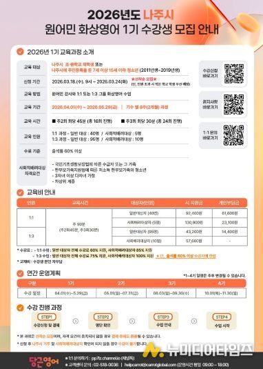 나주시는 오는 3월 18일부터 24일까지 관내 초‧중학생을 대상으로 ‘2026년 나주시 원어민 화상영어 1기’ 수강생 150명을 모집한다고 17일 밝혔다.