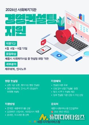세종시사회서비스원은 관내 사회복지시설의 운영역량 강화와 현장 애로사항 해소를 위해 ‘2026년 세종고수학당 경영컨설팅 지원’ 사업을 추진하고 컨설팅 지원을 희망하는 대상기관을 모집한다.