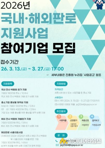 세종일자리경제진흥원은 지역 중소기업의 판로 확대와 수출경쟁력 강화를 위해 ‘2026년 세종시 국내·해외판로 지원사업’ 참여기업을 모집한다고 밝혔다.
