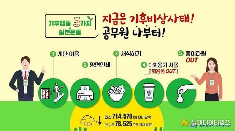 이유정 기후환경국장은 “탄소중립은 모두가 함께해야 이루어질 수 있는 목표이며, 단순하고 소소한 실천들이 이어져 습관으로 자리 잡게 되면 장기적으로 온실가스 감축에 긍정적인 효과를 가져올 것”이라며, “실천 수칙이 공직사회의 일상적인 습관으로 자리 잡을 수 있도록 지속적으로 홍보하고 지원하겠다.”라고 밝혔다.