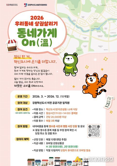(재)강원혁신도시발전지원센터에서는 강원혁신도시 이전 공공기관 임직원을 대상으로 지역 상권 활성화를 위한 ‘2026 우리동네 상권살리기 동네가게 On(溫)’사업을 추진한다고 밝혔다.