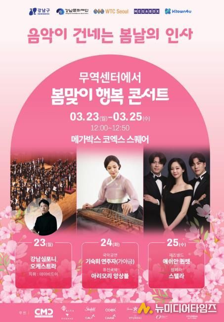 꿈이 모이는 도시, 미래를 그리는 강남구가 오는 3월 23일부터 25일까지 낮 12시부터 12시 50분까지 코엑스 메가박스 스퀘어(메가박스 입구)에서 구민과 방문객이 함께 즐길 수 있는 ‘봄맞이 행복콘서트’를 개최한다.
