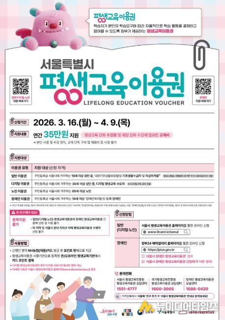 서울 도봉구가 2026년 평생교육이용권 신청자를 4월 9일까지 접수한다.