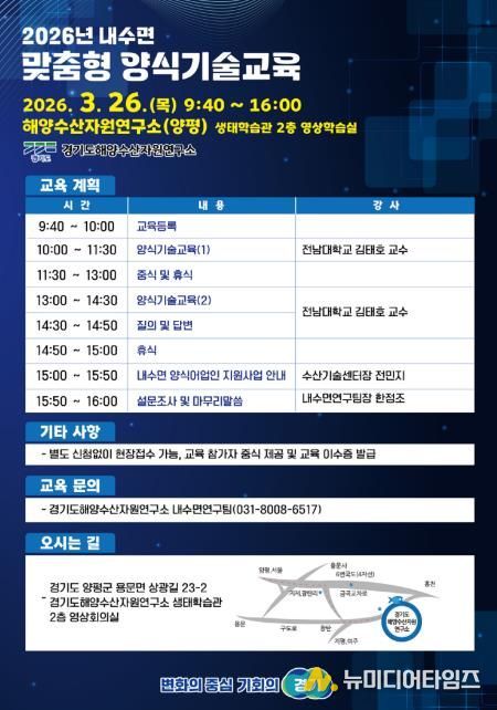 경기도해양자원연구소는 오는 26일 양평에 있는 연구소 생태학습관에서 내수면 양식 어업인의 역량 강화를 위한 양식기술교육을 실시한다.
