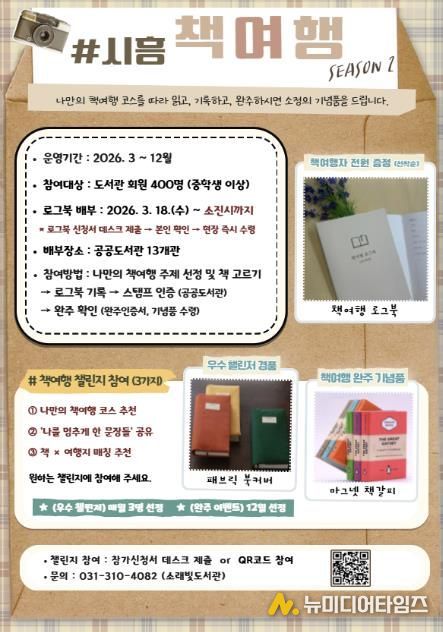 시흥시도서관은 시민의 독서 실천을 지원하고 일상 속 독서문화를 확산하기 위해 3월 18일부터 ‘2026 시흥 책여행(시즌2)’ 로그북을 배부하고, ‘책여행 로그북 챌린지’를 함께 운영한다.
