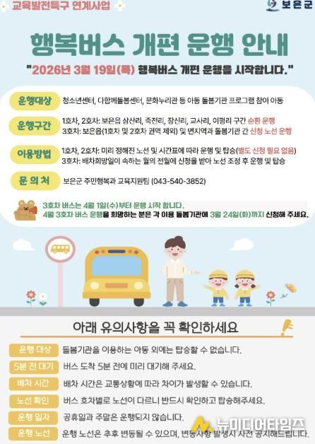 노선표 및 배차시간 등 자세한 사항은 보은군청 누리집 공지사항과 네이버밴드 ‘대추고을소식’, 각 돌봄기관을 통해 확인할 수 있으며, 관련 문의는 주민행복과 교육지원팀으로 하면 된다.