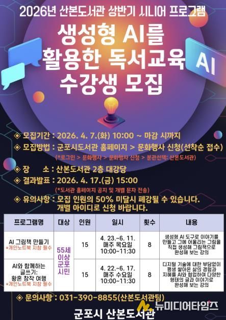 모집 대상은 55세 이상 군포 시민이며 산본도서관 2층 대강당에서 각 프로그램마다 8회차로 진행된다. 신청은 2026년 4월 7일부터 군포시 도서관 누리집을 통해 선착순으로 접수하고 수강생 명단은 4월 17일 도서관 누리집에 공지된다.