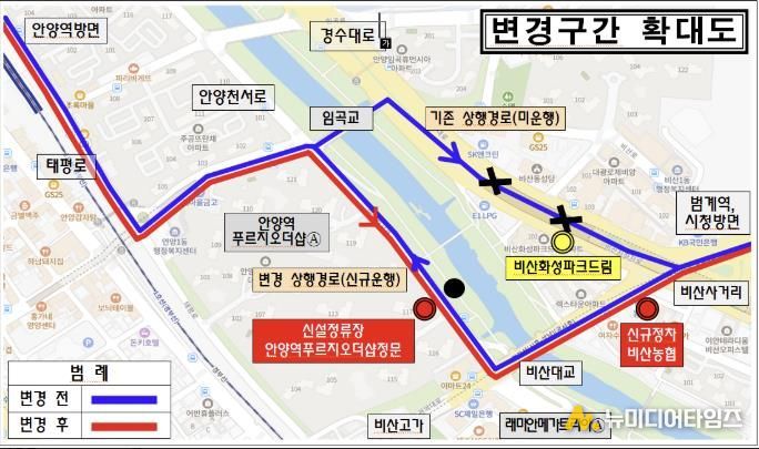 반면, 안양역에서 범계역 방면 운행 시 정차하던 기존 '비산화성파크드림' 정류장은 노선 효율화를 위해 더 이상 경유하지 않는다. 기존 이용객은 인접한 '비산농협'이나 '비산사거리.이마트' 정류장을 이용할 수 있다.