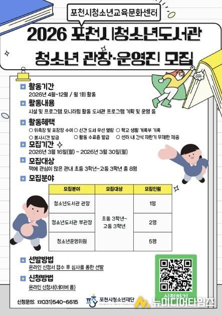 포천시청소년재단 포천시청소년교육문화센터는 청소년 참여형 도서관 운영을 위해 ‘2026년 포천시청소년도서관 청소년 관장 및 운영진’을 모집한다.