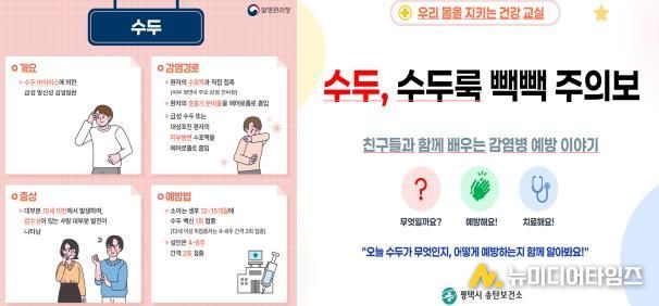 최근 3년간의 평택시 감염병 발생 데이터를 분석해 시기별 유행 가능성이 높은 감염병을 매월 선정하고 특히, 새 학기가 시작되는 3월에는 단체생활로 인해 감염 위험이 높은 ‘수두’를 이달의 감염병으로 선정, 유치원, 초등학교 등에 맞춤형 교육·홍보자료를 제공했다.
