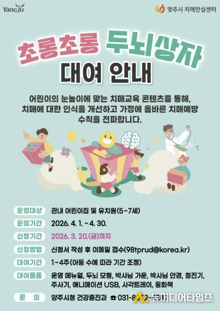 양주시서부치매안심센터는 어린이 대상 치매 인식개선사업인 ‘초롱초롱 두뇌상자’ 대여사업을 운영한다. 이번 사업은 어린이들의 눈높이에 맞춘 치매 교육을 통해 치매에 대한 올바른 이해를 돕고, 가족 내 치매 예방 실천 문화를 확산하기 위해 마련됐다.